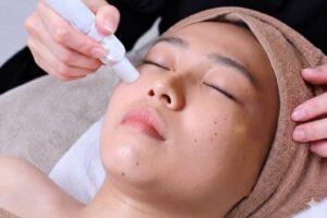 ・産毛とパウダーを払いパパイン酵素入りの美容液を塗布、汚れを浮かせます